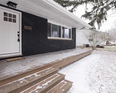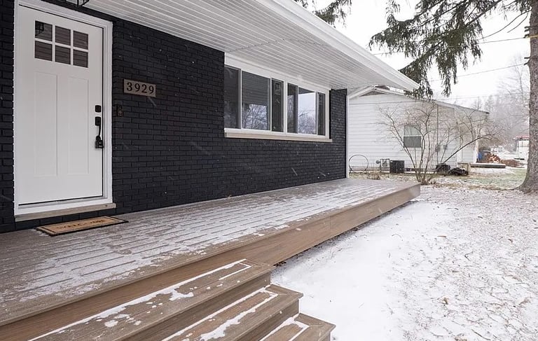 A modern take on a new front entry. Here we added the new door, a new large front window, modern number plate for the address, painted the brick black, and built a large, spacious front porch deck with trex that will last a long time and add a beautiful curb appeal. Handywork Hero can revamp your outdoor space!