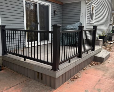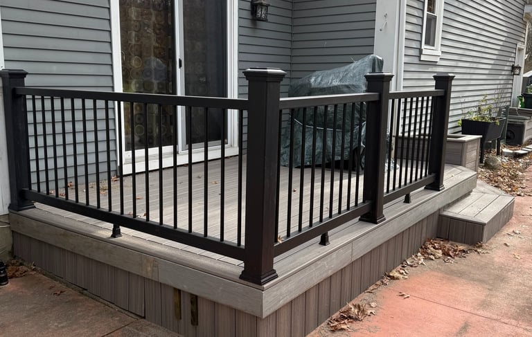 Here we took the deck footprint and changed the moldy, old wood deck boards and wood railing. We added trex side skirts and decking all around this deck with a modern vinyl black railing. We added a planter made out of the same trex boards to give this family a deck and patio that they can enjoy for many summers to come.